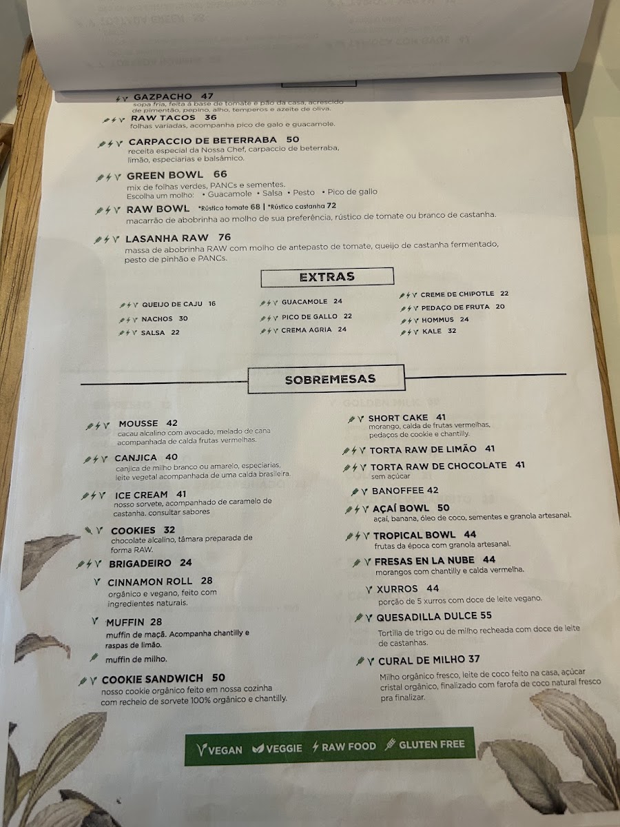 To finish off the meal, there are plenty of tempting Sobremesas Veganas Orgânicas (organic vegan desserts) including the Muffin De Milho and the indulgent Mousse De Xocolate Raw. The Cinnamon Roll Organico-Vegano is a must-try for dessert lovers.