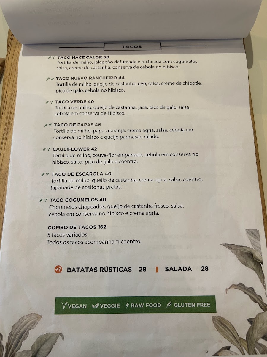 Tortilla de milho, creme de chipotle, salsa, cebola roxa, guacamole, sourcream (vegan), pico de gallo. Queijo e complemento a sua escolha.